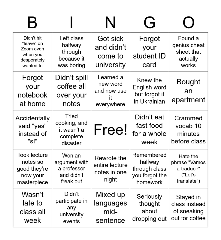 This bingo card has a free space and 39 words: Attended all lectures for a whole week, Didn’t snooze the alarm even once, Didn’t open Instagram or Telegram during a single lecture, Didn’t spill coffee all over your notes, Wasn’t late to class all week, Rewrote the entire lecture notes in one night, Learned a new word and now use it everywhere, Boldly shared your opinion during a seminar, Found a genius cheat sheet that actually works, Took lecture notes so good they’re now your masterpiece, Tried cooking, and it wasn’t a complete disaster, Forgot your student ID card, Stayed in class instead of sneaking out for coffee, Crammed vocab 10 minutes before class, Didn’t eat fast food for a whole week, Won an argument with a professor and didn’t freak out, Successfully emailed a professor without a single typo, Didn’t hit "leave" on Zoom even when you desperately wanted to, Passed a test without googling every single question, Remembered halfway through class you forgot the homework, Forgot your notebook at home, Mixed up languages mid-sentence, Knew the English word but forgot it in Ukrainian, Bought an apartment, Went to the seaside this year, Actually liked phonetics last semester, Had breakfast every day before classes, Already have another degree, Read 15 books in one year, Left class halfway through because it was boring, Didn’t use ChatGPT for homework, Ignored the air alarm and didn’t go to the shelter, Got sick and didn’t come to university, Didn’t participate in any university events, Seriously thought about dropping out, Didn’t read the assigned chapters for critical reading, Hate the phrase "Vamos a traducir" ("Let’s translate"), Accidentally said "yes" instead of "sí" and Chose instant noodles instead of a real meal.