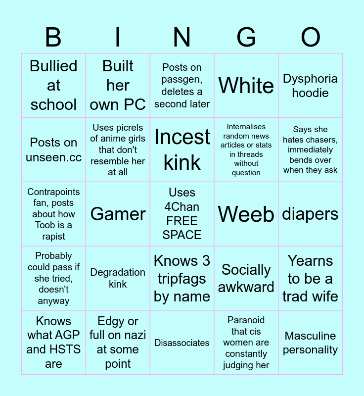 This bingo card has a free space and 24 words: Degradation kink, Edgy or full on nazi at some point, Incest kink, Knows what AGP and HSTS are, Dysphoria hoodie, Bullied at school, Posts on unseen.cc, Built her own PC, Weeb, Knows 3 tripfags by name, Internalises random news articles or stats in threads without question, Contrapoints fan, posts about how Toob is a rapist, Socially awkward, Yearns to be a trad wife, Uses picrels of anime girls that don't resemble her at all, Paranoid that cis women are constantly judging her, diapers, Posts on passgen, deletes a second later, Says she hates chasers, immediately bends over when they ask, Gamer, Masculine personality, Probably could pass if she tried, doesn't anyway, White and Disassociates.