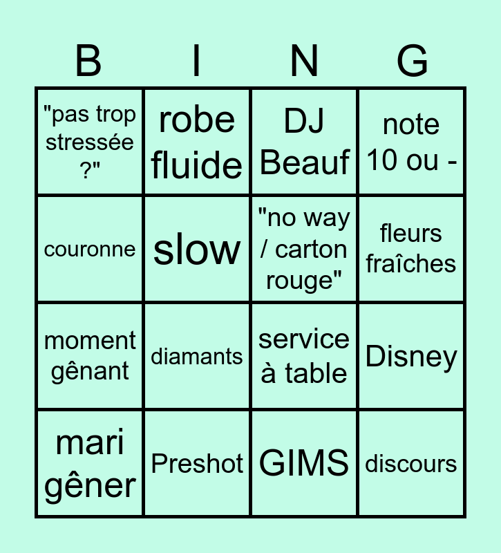 This bingo card has 16 words: Preshot, Disney, DJ Beauf, "pas trop stressée ?", moment gênant, robe fluide, service à table, GIMS, couronne, slow, mari gêner, note 10 ou -, diamants, fleurs fraîches, "no way / carton rouge" and discours.