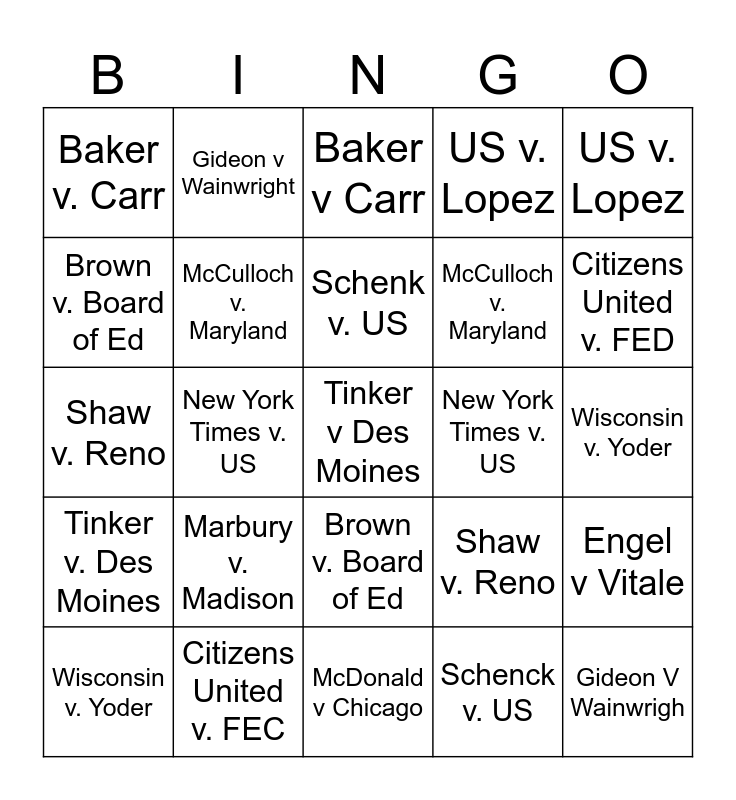 ⚠ This card has duplicate items: Marbury v. Madison (2), McCulloch v. Maryland (2), Brown v. Board of Ed (2), New York Times v. US (2), Wisconsin v. Yoder (2), Shaw v. Reno (2), US v. Lopez (2), McDonald v Chicago (2)