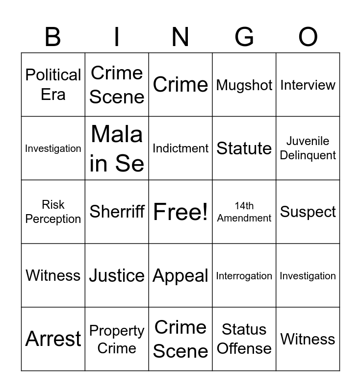 This bingo card has a free space and 29 words: Arrest, 4th Amendment, Sherriff, Discretion, Political Era, Crime, Mala in Se, Justice, 14th Amendment, Property Crime, Suspect, Witness, Crime Scene, Status Offense, Juvenile Delinquent, Indictment, Appeal, Witness, Interview, Risk Perception, Interrogation, Seizure, Statute, Investigation, Mugshot, Crime Scene, Investigation, Indictment and Appeal.