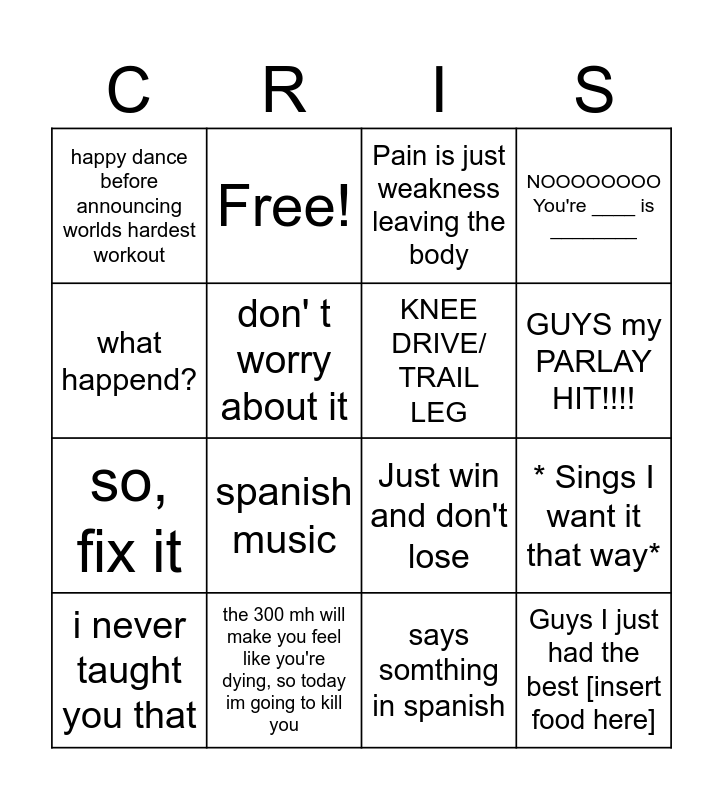 This bingo card has 16 words: the 300 mh will make you feel like you're dying, so today im going to kill you, * Sings I want it that way*, Pain is just weakness leaving the body, happy dance before announcing worlds hardest workout, so, fix it, Free!, Just win and don't lose, says somthing in spanish, what happend?, don' t worry about it, i never taught you that, NOOOOOOOO You're ____ is ________, spanish music, GUYS my PARLAY HIT!!!!, KNEE DRIVE/ TRAIL LEG and Guys I just had the best [insert food here].