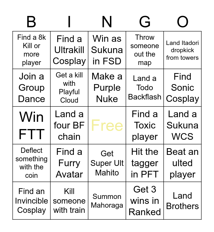 This bingo card has a free space and 24 words: Find a Furry Avatar, Kill someone with train, Make a Purple Nuke, Find an Invincible Cosplay, Land Itadori dropkick from towers, Find a 8k Kill or more player, Join a Group Dance, Find a Ultrakill Cosplay, Find a Toxic player, Get Super Ult Mahito, Land a Todo Backflash, Win FTT, Hit the tagger in PFT, Beat an ulted player, Get a kill with Playful Cloud, Get 3 wins in Ranked, Land a Sukuna WCS, Win as Sukuna in FSD, Find Sonic Cosplay, Land a four BF chain, Land Brothers, Deflect something with the coin, Throw someone out the map and Summon Mahoraga.