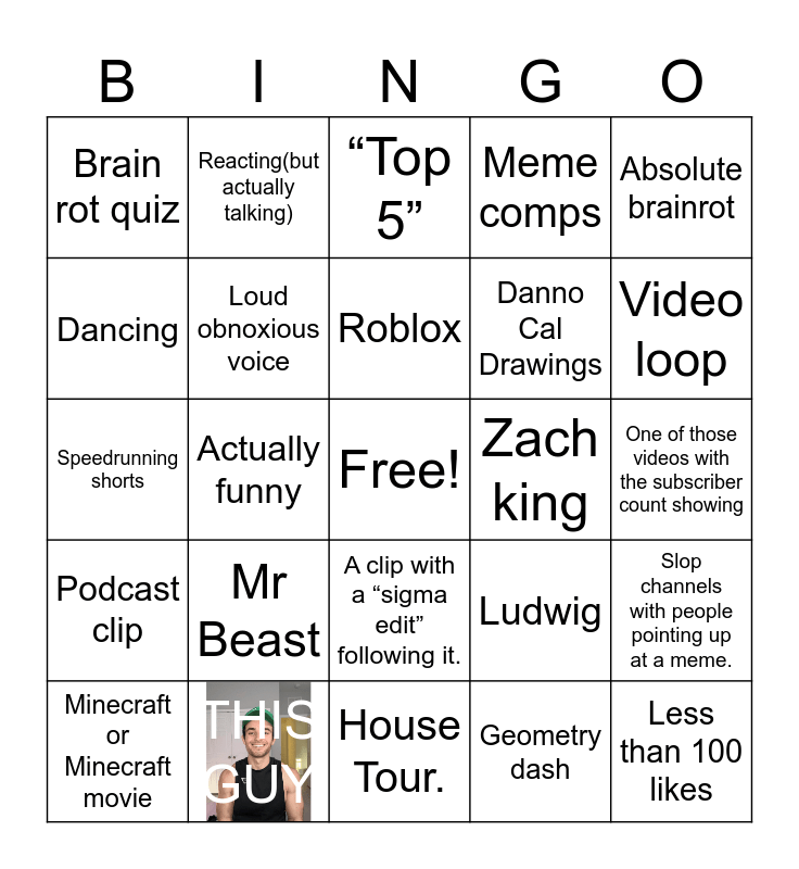 This bingo card has 1 images, a free space and 24 words: Mr Beast, THIS GUY, Roblox, Minecraft or Minecraft movie, Absolute brainrot, Brain rot quiz, Dancing, Reacting(but actually talking), Zach king, A clip with a “sigma edit” following it., Danno Cal Drawings, Speedrunning shorts, Ludwig, Slop channels with people pointing up at a meme., Loud obnoxious voice, Geometry dash, One of those videos with the subscriber count showing, “Top 5”, Video loop, Actually funny, Less than 100 likes, Podcast clip, Meme comps and House Tour..