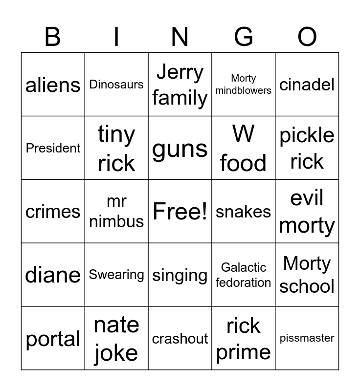 This bingo card has a free space and 24 words: Swearing, nate joke, guns, portal, cinadel, aliens, President, Dinosaurs, snakes, singing, W food, crimes, Galactic fedoration, Morty school, tiny rick, rick prime, evil morty, Jerry family, pickle rick, mr nimbus, pissmaster, diane, Morty mindblowers and crashout.