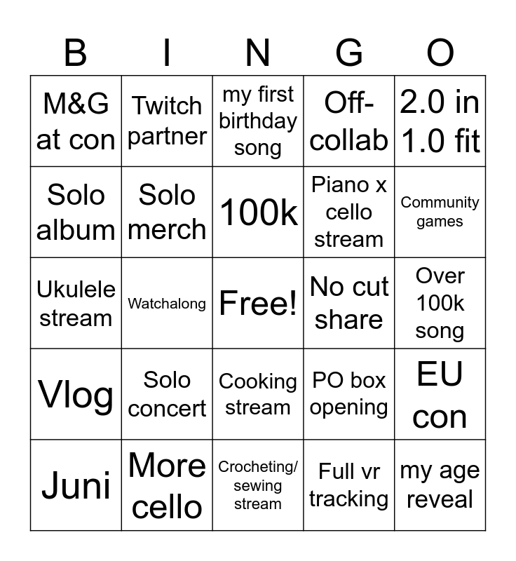 This bingo card has a free space and 24 words: Solo concert, More cello, 100k, Juni, 2.0 in 1.0 fit, M&G at con, Solo album, Twitch partner, No cut share, Cooking stream, Piano x cello stream, Ukulele stream, PO box opening, EU con, Solo merch, Full vr tracking, Over 100k song, my first birthday song, Community games, Watchalong, my age reveal, Vlog, Off-collab and Crocheting/ sewing stream.