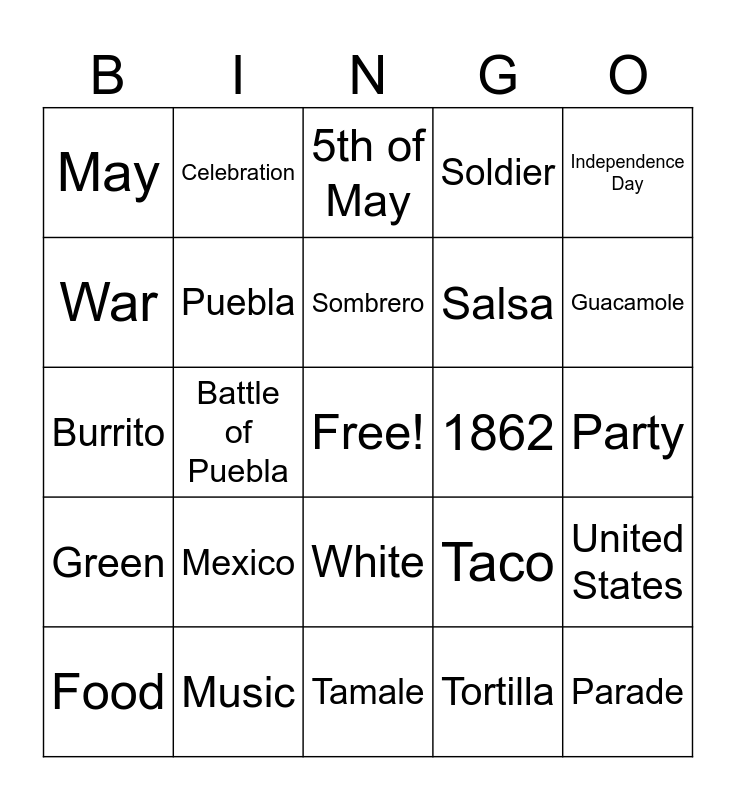 This bingo card has a free space and 29 words: Food, Rice pudding, Battle of Puebla, Flag, May, 5th of May, Puebla, Mexico, 1862, Music, Party, Parade, Tamale, Tortilla, Guacamole, Red, White, Green, Independence Day, Burrito, Taco, Enchilada, Salsa, War, Soldier, Celebration, United States, Sombrero and Jarritos.