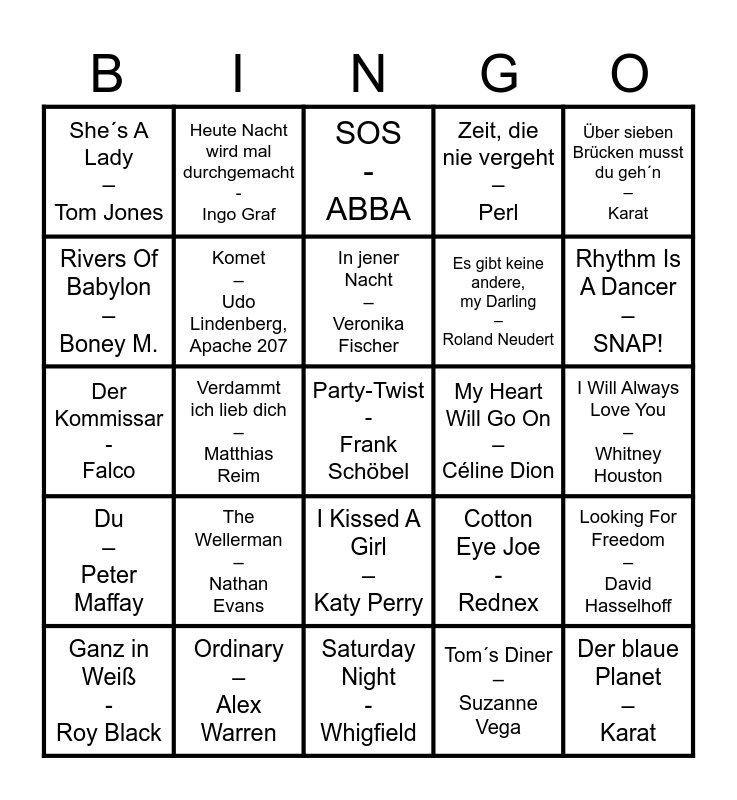 This bingo card has a free space and 32 words: Tom´s Diner – Suzanne Vega, Griechischer Wein – Udo Jürgens, Verdammt ich lieb dich – Matthias Reim, These Boots Are Made For Walkin´ – Nancy Sinatra, Du – Peter Maffay, Komet – Udo Lindenberg, Apache 207, Über sieben Brücken musst du geh´n – Karat, Looking For Freedom – David Hasselhoff, Heute Nacht wird mal durchgemacht - Ingo Graf, You´re My Heart, You´re My Soul – Modern Talking, In jener Nacht – Veronika Fischer, SOS - ABBA, Help - Beatles, Hello - Adele, My Heart Will Go On – Céline Dion, Durch den Monsun – Tokio Hotel, Ganz in Weiß - Roy Black, Der Kommissar - Falco, I Kissed A Girl – Katy Perry, The Wellerman – Nathan Evans, Cotton Eye Joe - Rednex, Santa Maria – Roland Kaiser, I Will Always Love You – Whitney Houston, Ordinary – Alex Warren, Der blaue Planet – Karat, Zeit, die nie vergeht – Perl, Es gibt keine andere, my Darling – Roland Neudert, Rivers Of Babylon – Boney M., She´s A Lady – Tom Jones, Saturday Night - Whigfield, YMCA – Village People and Rhythm Is A Dancer – SNAP!.
