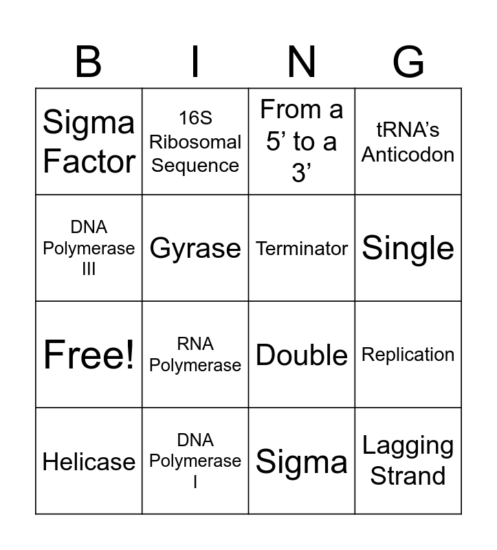 This bingo card has 20 words: Replication, Transcription and Translation, From a 5’ to a 3’, Nucleotides, Phosphates, & a Nitrogenous Base, Helicase, DNA Polymerase III, DNA Polymerase I, Sigma Factor, Free!, 16S Ribosomal Sequence, RNA Polymerase, Double, Gyrase, Lagging Strand, Terminator, Holoenzyme, Single, tRNA’s Anticodon, Sigma and Okazaki.