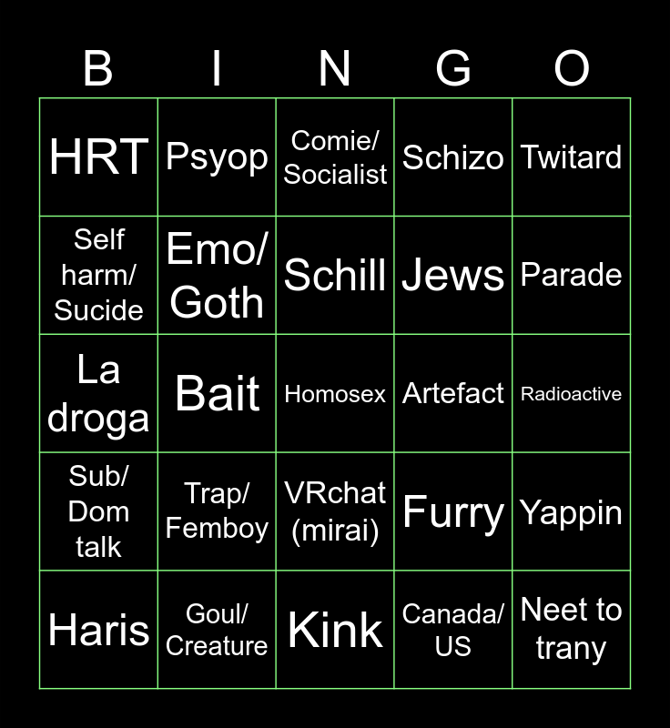 This bingo card has a free space and 24 words: Trap/ Femboy, Goul/ Creature, Schill, Haris, Twitard, HRT, Self harm/ Sucide, Psyop, Artefact, VRchat (mirai), Jews, La droga, Furry, Yappin, Emo/ Goth, Canada/ US, Radioactive, Comie/ Socialist, Parade, Bait, Neet to trany, Sub/ Dom talk, Schizo and Kink.