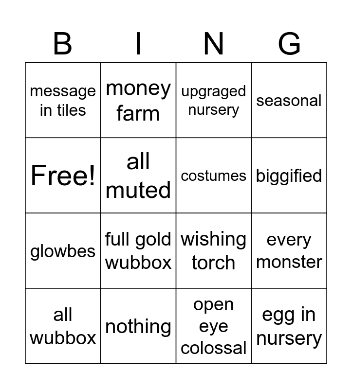 This bingo card has 16 words: nothing, every monster, upgraged nursery, message in tiles, glowbes, money farm, wishing torch, open eye colossal, Free!, all muted, all wubbox, seasonal, full gold wubbox, biggified, costumes and egg in nursery.