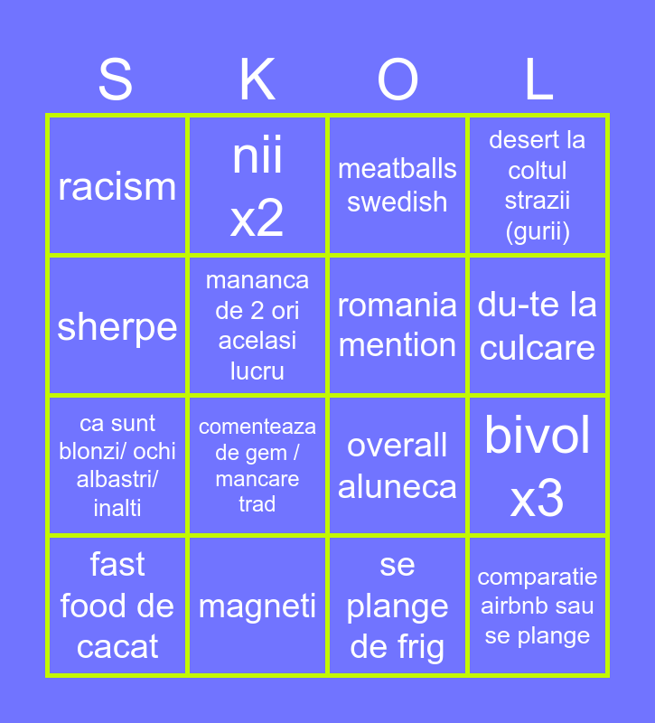 This bingo card has 16 words: magneti, bivol x3, meatballs swedish, racism, ca sunt blonzi/ ochi albastri/ inalti, nii x2, overall aluneca, se plange de frig, sherpe, mananca de 2 ori acelasi lucru, fast food de cacat, desert la coltul strazii (gurii), comenteaza de gem / mancare trad, du-te la culcare, romania mention and comparatie airbnb sau se plange.