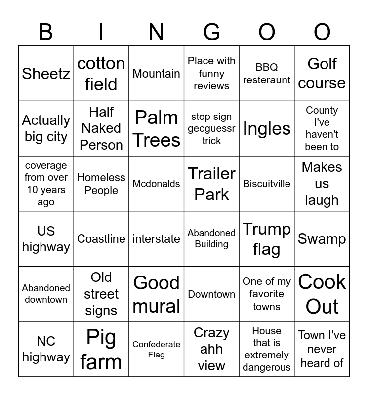 This bingo card has 40 words: Confederate Flag, Ingles, I've been on this road, Actually big city, Abandoned Building, Makes us laugh, Half Naked Person, Could be anywhere, BBQ resteraunt, Trailer Park, County I've haven't been to, Place with funny reviews, coverage from over 10 years ago, Mcdonalds, Homeless People, Biscuitville, Cook Out, Sheetz, Crazy ahh view, Mountain, Coastline, Swamp, Palm Trees, Golf course, House that is extremely dangerous, Downtown, Old street signs, Town I've never heard of, Abandoned downtown, Good mural, Good sign, interstate, NC highway, US highway, stop sign geoguessr trick, Trump flag, One of my favorite towns, Pig farm, cotton field and courthouse.