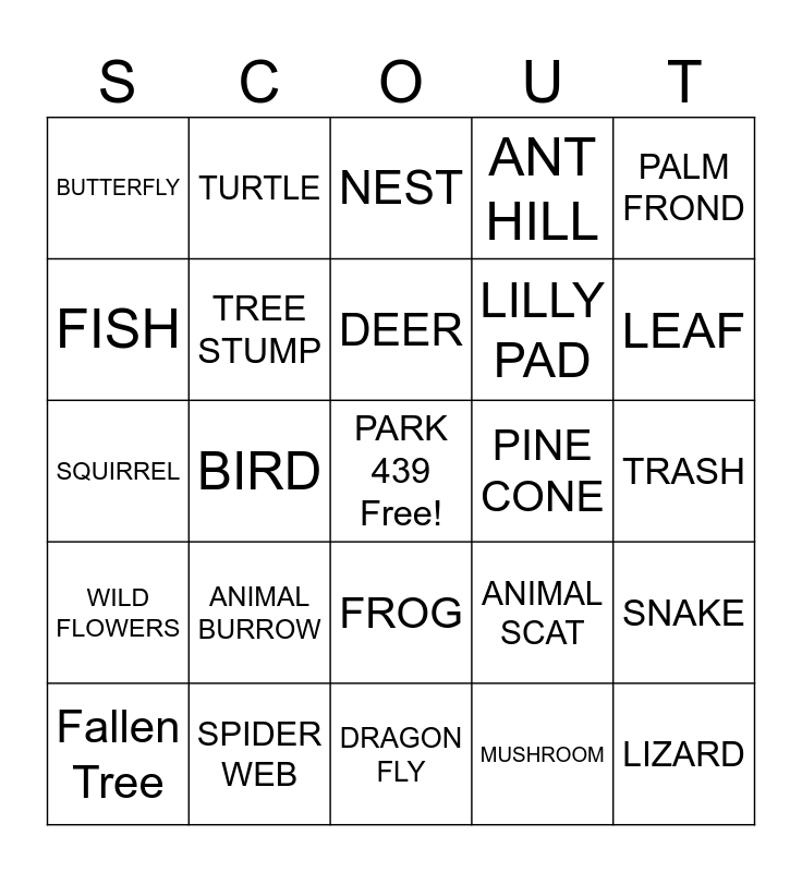 This bingo card has a free space and 29 words: Fallen Tree, Moss, BIRD, TRAIL MARKER, BUTTERFLY, NEST, TREE STUMP, ANIMAL BURROW, PINE CONE, SPIDER WEB, TRASH, LIZARD, DRAGON FLY, MUSHROOM, LEAF, FEATHER, FROG, WILD FLOWERS, PALM FROND, SQUIRREL, ANIMAL SCAT, ANIMAL FOOT PRINTS, LILLY PAD, FISH, ANT HILL, TURTLE, SNAKE, DEER and HOLE IN TREE.