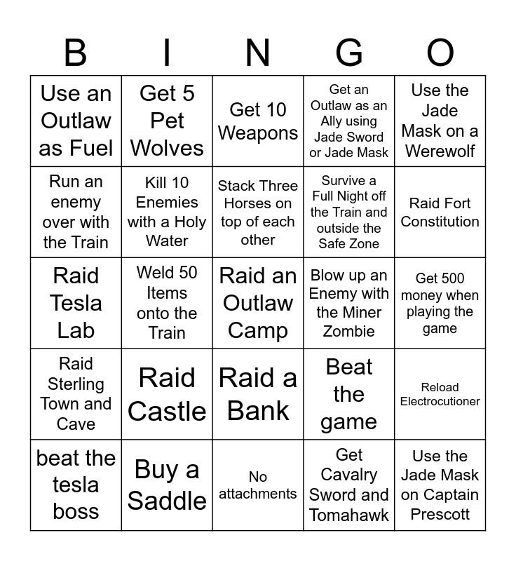 This bingo card has 25 words: Raid Castle, No attachments, Stack Three Horses on top of each other, beat the tesla boss, Use the Jade Mask on a Werewolf, Use an Outlaw as Fuel, Run an enemy over with the Train, Get 5 Pet Wolves, Blow up an Enemy with the Miner Zombie, Raid a Bank, Survive a Full Night off the Train and outside the Safe Zone, Raid Tesla Lab, Beat the game, Reload Electrocutioner, Kill 10 Enemies with a Holy Water, Use the Jade Mask on Captain Prescott, Get 500 money when playing the game, Get 10 Weapons, Raid Fort Constitution, Weld 50 Items onto the Train, Raid an Outlaw Camp, Buy a Saddle, Raid Sterling Town and Cave, Get an Outlaw as an Ally using Jade Sword or Jade Mask and Get Cavalry Sword and Tomahawk.