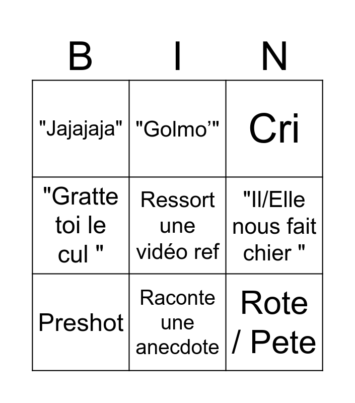 This bingo card has a free space and 8 words: "Il/Elle nous fait chier ", Cri, "Golmo’", Preshot, "Jajajaja", Rote / Pete, "Gratte toi le cul " and Raconte une anecdote.
