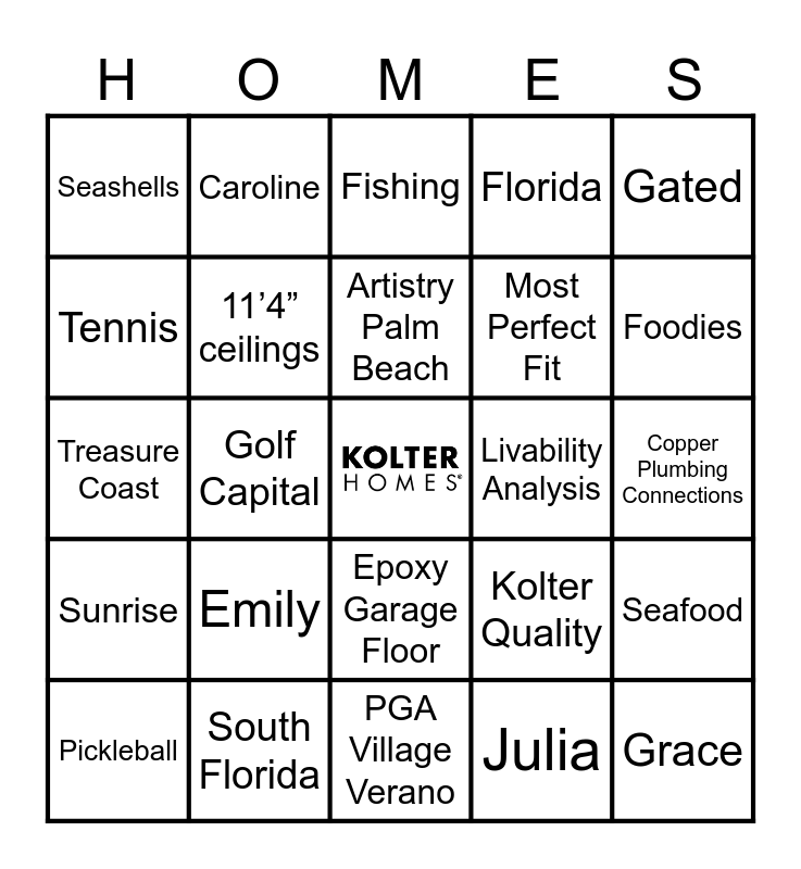 This bingo card has a free space and 90 words: 11’4” ceilings, Impact Glass, Epoxy Garage Floor, Spray Foam Insulation, Transom Windows, 3 Car Garages, Gated, Concrete Tile Roof, Tray Ceilings, Design Studio, Tankless Water Heaters, Natural Gas, ZIP System Sheathing, Copper Plumbing Connections, Dust Boxes in Door Latch, Artistry Palm Beach, Astor Creek Golf & Country Club, Canopy Creek, Cresswind Palm Beach, Cove Royale, L’Ambiance at Avenir, Esprit at Avenir, PGA Village Verano, Palm Beaches, Treasure Coast, South Florida, Master Planned Community, Active Adult, Lifestyle, Location, Beach, Seafood, Palm Trees, Sunrise, Seashells, Florida, Fishing, Boating, Golf Capital, Foodies, Pickleball, Tennis, Shopping, Mall, Airport, Kolter Quality, Privately Owned, Realtor Friendly, Single Family Homes, Personalization, Built Around You, Most Perfect Fit, Decision Priorites, Value Map, Realtor Portal, Floor Plan Voting, Livability Analysis, Matching, Consultant, Guide, Mondrian, Trumbull, Vasari, West, Madison, Paige, Lila, Julia, Riley, Sydney, Emily, Grace, Allison, Beverly, Caroline, 11’4” ceilings, Impact Glass, Epoxy Garage Floor, Spray Foam Insulation, Transom Windows, 3 Car Garages, Gated, Concrete Tile Roof, Tray Ceilings, Design Studio, Tankless Water Heaters, Natural Gas, ZIP System Sheathing, Copper Plumbing Connections and Dust Boxes in Door Latch.