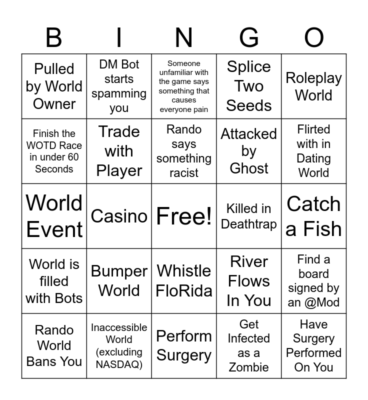 This bingo card has a free space and 33 words: Random Friend Request, Drop Game, Casino, Rando says Swears, World is filled with Bots, Trade with Player, Roleplay World, Rando World Bans You, DM Bot starts spamming you, Server Crashes, Rando says something racist, Someone unfamiliar with the game says something that causes everyone pain, Lore Dump, Inappropriate Super Broadcast, Killed in Deathtrap, Flirted with in Dating World, Inaccessible World (excluding NASDAQ), World Event, Bumper World, River Flows In You, Whistle FloRida, Finish a Parkour World, Pulled by World Owner, Catch a Fish, Perform Surgery, Have Surgery Performed On You, Splice Two Seeds, Attacked by Ghost, Finish the WOTD Race in under 60 Seconds, Find a board signed by an @Mod, Zombie Test, Get Infected as a Zombie and Rando asks for Donation.