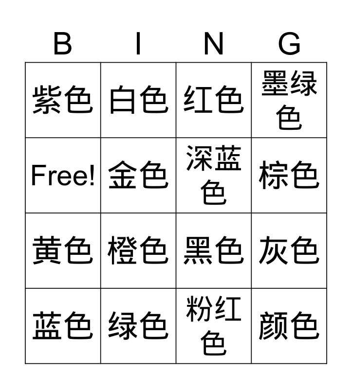 This bingo card has 16 words: 绿色, 灰色, 红色, 紫色, 黄色, 白色, 黑色, 粉红色, Free!, 金色, 蓝色, 墨绿色, 橙色, 棕色, 深蓝色 and 颜色.