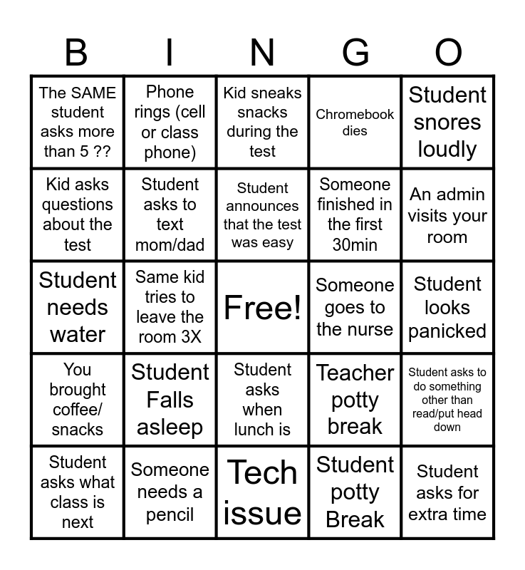 This bingo card has a free space and 24 words: Student Falls asleep, Someone needs a pencil, Student announces that the test was easy, Student asks what class is next, Student snores loudly, The SAME student asks more than 5 ??, Kid asks questions about the test, Phone rings (cell or class phone), Someone goes to the nurse, Student asks when lunch is, Someone finished in the first 30min, Student needs water, Teacher potty break, Student asks to do something other than read/put head down, Student asks to text mom/dad, Student potty Break, Student looks panicked, Kid sneaks snacks during the test, An admin visits your room, Same kid tries to leave the room 3X, Student asks for extra time, You brought coffee/ snacks, Chromebook dies and Tech issue.