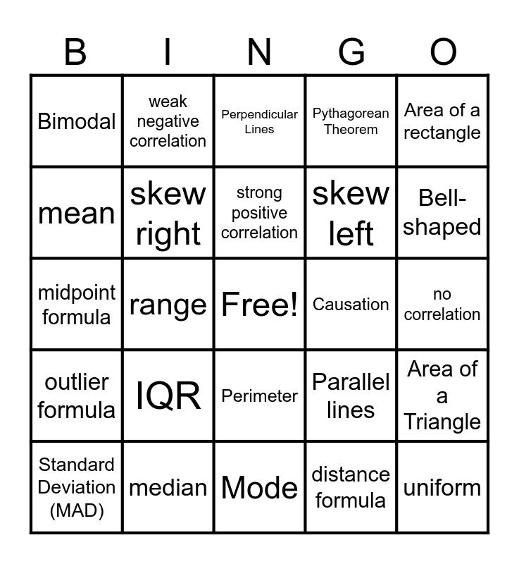 This bingo card has a free space and 24 words: IQR, median, strong positive correlation, Standard Deviation (MAD), Area of a rectangle, Bimodal, mean, weak negative correlation, Causation, Perimeter, skew left, midpoint formula, Parallel lines, Area of a Triangle, skew right, distance formula, no correlation, Perpendicular Lines, Bell-shaped, range, uniform, outlier formula, Pythagorean Theorem and Mode.