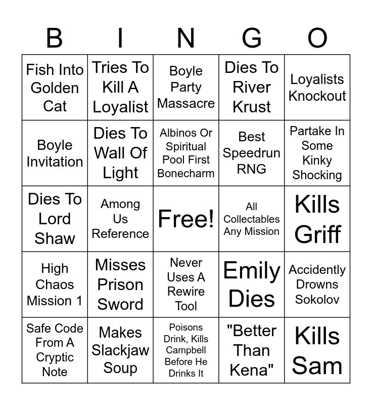 This bingo card has a free space and 24 words: Misses Prison Sword, Makes Slackjaw Soup, Albinos Or Spiritual Pool First Bonecharm, Safe Code From A Cryptic Note, Loyalists Knockout, Fish Into Golden Cat, Boyle Invitation, Tries To Kill A Loyalist, All Collectables Any Mission, Never Uses A Rewire Tool, Best Speedrun RNG, Dies To Lord Shaw, Emily Dies, Accidently Drowns Sokolov, Dies To Wall Of Light, "Better Than Kena", Kills Griff, Boyle Party Massacre, Partake In Some Kinky Shocking, Among Us Reference, Kills Sam, High Chaos Mission 1, Dies To River Krust and Poisons Drink, Kills Campbell Before He Drinks It.