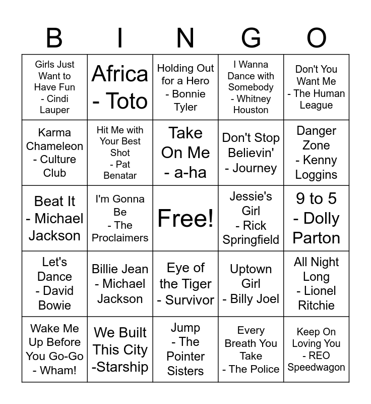This bingo card has a free space and 24 words: Billie Jean - Michael Jackson, We Built This City -Starship, Take On Me - a-ha, Wake Me Up Before You Go-Go - Wham!, Don't You Want Me - The Human League, Girls Just Want to Have Fun - Cindi Lauper, Karma Chameleon - Culture Club, Africa - Toto, Jessie's Girl - Rick Springfield, Eye of the Tiger - Survivor, Don't Stop Believin' - Journey, Beat It - Michael Jackson, Uptown Girl - Billy Joel, All Night Long - Lionel Ritchie, Hit Me with Your Best Shot - Pat Benatar, Every Breath You Take - The Police, 9 to 5 - Dolly Parton, Holding Out for a Hero - Bonnie Tyler, Danger Zone - Kenny Loggins, I'm Gonna Be - The Proclaimers, Keep On Loving You - REO Speedwagon, Let's Dance - David Bowie, I Wanna Dance with Somebody - Whitney Houston and Jump - The Pointer Sisters.