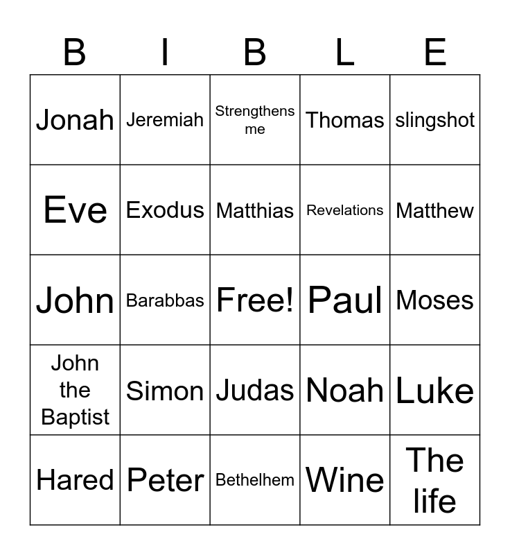 This bingo card has a free space and 30 words: Peter, Adam, Barabbas, Psalms, Jonah, Strengthens me, Exodus, Judas, Paul, Bethelhem, Moses, The life, Wine, Lazarus, Matthew, 5000, Noah, John the Baptist, Simon, slingshot, John, 40, Jeremiah, Revelations, Eve, Thomas, Luke, Hared, Matthias and Mary Magdalene.