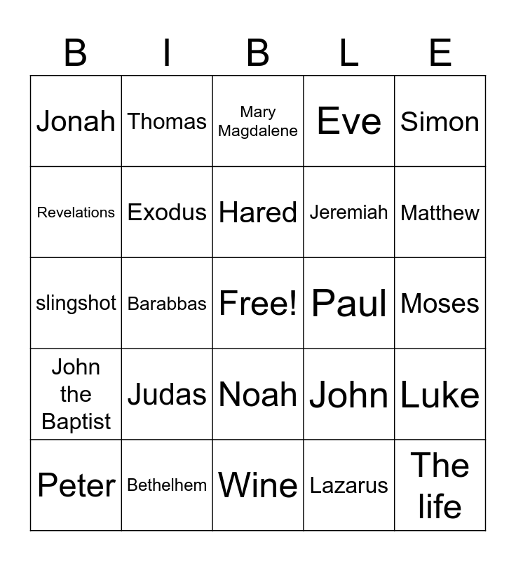 This bingo card has a free space and 29 words: Peter, Adam, Barabbas, Psalms, Jonah, Mary Magdalene, Exodus, Judas, Paul, Bethelhem, Moses, The life, Wine, Lazarus, Matthew, 5000, Noah, John the Baptist, Simon, slingshot, John, 40, Jeremiah, Revelations, Eve, Thomas, Luke, Hared and Matthias.