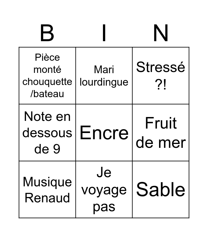 This bingo card has a free space and 8 words: Fruit de mer, Stressé ?!, Mari lourdingue, Musique Renaud, Pièce monté chouquette /bateau, Sable, Note en dessous de 9 and Je voyage pas.