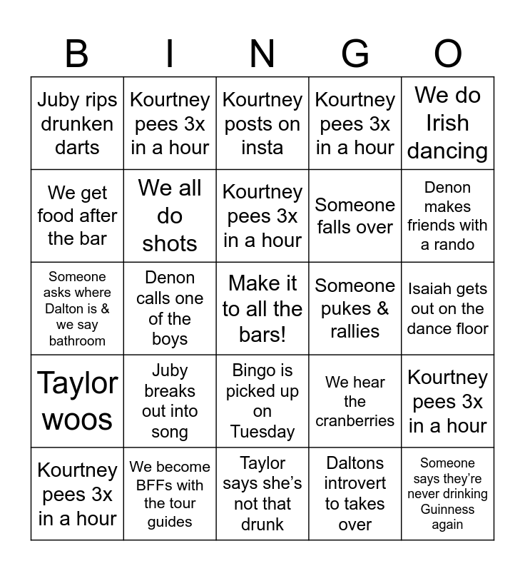 This bingo card has a free space and 29 words: Kourtney pees 3x in a hour, Someone splits the G, Denon calls one of the boys, Micro aggression, Juby rips drunken darts, Kourtney posts on insta, We all do shots, Juby breaks out into song, Someone pukes & rallies, We become BFFs with the tour guides, Isaiah gets out on the dance floor, Someone says they’re never drinking Guinness again, Taylor says she’s not that drunk, Daltons introvert to takes over, Denon makes friends with a rando, Get hit on by the bartender, Bingo is picked up on Tuesday, Taylor woos, We do Irish dancing, Someone asks where Dalton is & we say bathroom, We hear the cranberries, Find out Isaiah’s drunken quick, Someone falls over, We get food after the bar, Kourtney pees 3x in a hour, Kourtney pees 3x in a hour, Kourtney pees 3x in a hour, Kourtney pees 3x in a hour and Kourtney pees 3x in a hour.