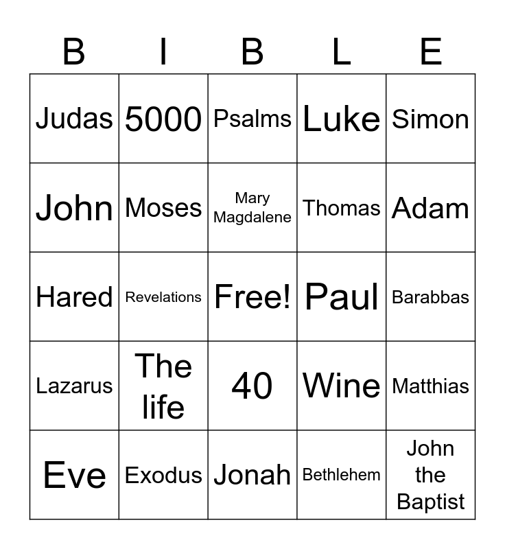 This bingo card has a free space and 29 words: Eve, Peter, Revelations, Slingshot, Judas, Psalms, Moses, The life, Paul, Exodus, Barabbas, John the Baptist, Jonah, Bethlehem, Adam, Matthew, 40, Lazarus, Simon, Hared, Wine, Jeremiah, Thomas, John, Luke, 5000, Matthias, Mary Magdalene and Noah.