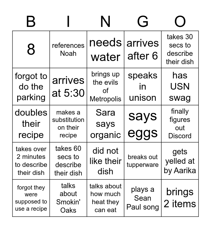 This bingo card has a free space and 24 words: takes 60 secs to describe their dish, talks about Smokin' Oaks, brings up the evils of Metropolis, forgot they were supposed to use a recipe, takes 30 secs to describe their dish, 8, forgot to do the parking, references Noah, says eggs, did not like their dish, speaks in unison, doubles their recipe, breaks out tupperware, gets yelled at by Aarika, arrives at 5:30, plays a Sean Paul song, finally figures out Discord, needs water, has USN swag, makes a substitution on their recipe, brings 2 items, takes over 2 minutes to describe their dish, arrives after 6 and talks about how much heat they can eat.