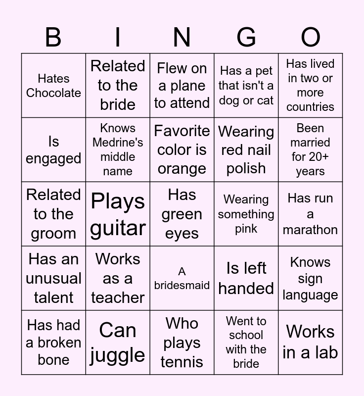 This bingo card has 36 words: Has met a celebrity, Has a birthday in December, Knows Ethan's middle name, Knows Medrine's middle name, Is left handed, Has an unusual talent, Favorite color is orange, Speaks two or more languages, Has lived in two or more countries, Has a food allergy, Plays guitar, Has a pet that isn't a dog or cat, The oldest sibling, Wearing something pink, Been married for 20+ years, Hates Chocolate, Works in a lab, Works as a teacher, Has green eyes, Flew on a plane to attend, Has run a marathon, Knows sign language, Can juggle, Has had a broken bone, Who plays tennis, Related to the bride, Related to the groom, Wearing a black tie, Wearing red nail polish, Is engaged, Wearing contacts, Went to school with the groom, Went to school with the bride, A bridesmaid, A groomsman and Owns a business.