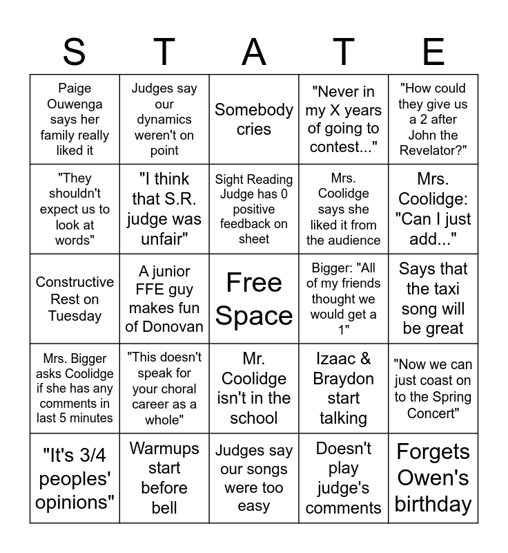 This bingo card has a free space and 24 words: "This doesn't speak for your choral career as a whole", Warmups start before bell, Sight Reading Judge has 0 positive feedback on sheet, "It's 3/4 peoples' opinions", "How could they give us a 2 after John the Revelator?", Paige Ouwenga says her family really liked it, "They shouldn't expect us to look at words", Judges say our dynamics weren't on point, Bigger: "All of my friends thought we would get a 1", Mr. Coolidge isn't in the school, Mrs. Coolidge says she liked it from the audience, Constructive Rest on Tuesday, Izaac & Braydon start talking, "Now we can just coast on to the Spring Concert", "I think that S.R. judge was unfair", Doesn't play judge's comments, Says that the taxi song will be great, Somebody cries, Mrs. Coolidge: "Can I just add...", A junior FFE guy makes fun of Donovan, Forgets Owen's birthday, Mrs. Bigger asks Coolidge if she has any comments in last 5 minutes, "Never in my X years of going to contest..." and Judges say our songs were too easy.