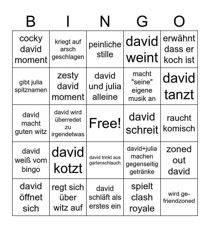 This bingo card has a free space and 24 words: david kotzt, regt sich über witz auf, david und julia alleine, david öffnet sich, erwähnt dass er koch ist, cocky david moment, gibt julia spitznamen, kriegt auf arsch geschlagen, david schreit, david trinkt aus gartenschlauch, macht "seine" eigene musik an, david macht guten witz, david+julia machen gegenseitig getränke, zoned out david, zesty david moment, spielt clash royale, raucht komisch, peinliche stille, david tanzt, david wird überredet zu irgendetwas, wird ge-friendzoned, david weiß vom bingo, david weint and david schläft als erstes ein.