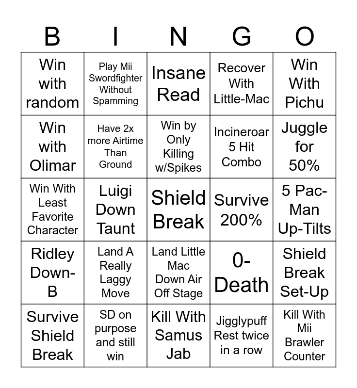 This bingo card has a free space and 26 words: Land Little Mac Down Air Off Stage, Jigglypuff Rest twice in a row, Win by Only Killing w/Spikes, SD on purpose and still win, Win With Pichu, Win with random, Win with Olimar, Play Mii Swordfighter Without Spamming, 5 Pac-Man Up-Tilts, 0-Death, Incineroar 5 Hit Combo, Win With Least Favorite Character, Shield Break Set-Up, Survive Shield Break, Luigi Down Taunt, K-Rool Up-Smash Spike, Recover With Little-Mac, Ridley Down-B, Insane Read, Kill With Mii Brawler Counter, Juggle for 50%, Kill With Samus Jab, Survive 200%, Land A Really Laggy Move, Have 2x more Airtime Than Ground and Land A Meter Attack.
