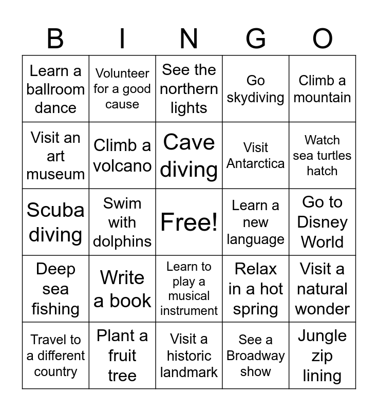 This bingo card has a free space and 29 words: Travel to a different country, Ride a hot air balloon, Swim with dolphins, Run a marathon, Learn a ballroom dance, See the northern lights, Climb a volcano, Write a book, Learn a new language, Plant a fruit tree, Go to Disney World, Jungle zip lining, Visit a historic landmark, See a Broadway show, Watch sea turtles hatch, Ride in a helicopter, Learn to play a musical instrument, Deep sea fishing, Climb a mountain, Scuba diving, Relax in a hot spring, Win the lottery, Visit Antarctica, Visit an art museum, Go skydiving, Volunteer for a good cause, Visit a natural wonder, Cave diving and Go on a cruise.