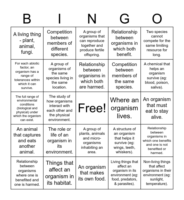 This bingo card has a free space and 30 words: Things that affect an organism in its habitat., The study of living things., The study of how organisms interact with each other and the physical environment., The area where an organism lives and all the things that affect it in that area., A living thing - plant, animal, fungi., A group of organisms that can reproduce together and produce fertile offspring., A group of organisms of the same species living in the same location., A group of plants, animals and micro-organisms inhabiting an area., Where an organism lives., An organism that makes its own food., An organism that must eat to stay alive., Non-living things that affect organisms in their environment (eg: sunlight, temperature)., Living things that affect an organism in its environment (eg: food, predators, & parasites)., A feature of an organism that helps it survive in that environment., A chemical that helps an organism survive (eg: blood, poison, saliva)., A behaviour that helps an organism survive (eg: hunting in packs, parental care)., A structure of an organism that helps it survive (eg: wings, teeth, whiskers)., An animal that captures and eats another animal., The role or life of an organism in its environment., Two species cannot compete for the same limiting resource for long., The full range of environmental conditions (biological and physical) under which the organism can exist., The niche that is actually occupied. It is narrower than the fundamental niche., Competition between members of different species., Competition between members of the same species., For each abiotic factor, an organism has a range of tolerances within which it can survive., Relationship between organisms in which both benefit., Relationship between organisms in which one benefits and one is not benefited or harmed., Relationship between organisms where one is benefited and one is harmed., Relationship between organisms in which both are harmed. and Organisms that produce their own food.