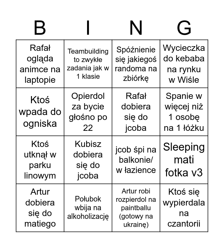 This bingo card has 16 words: Połubok wbija na alkoholizację, Sleeping mati fotka v3, Spóźnienie się jakiegoś randoma na zbiórkę, Rafał ogląda animce na laptopie, Ktoś utknął w parku linowym, Teambuilding to zwykłe zadania jak w 1 klasie, jcob śpi na balkonie/ w łazience, Artur robi rozpierdol na paintballu (gotowy na ukrainę), Ktoś wpada do ogniska, Opierdol za bycie głośno po 22, Artur dobiera się do matiego, Wycieczka do kebaba na rynku w Wiśle, Kubisz dobiera się do jcoba, Spanie w więcej niż 1 osobę na 1 łóżku, Rafał dobiera się do jcoba and Ktoś się wypierdala na czantorii.