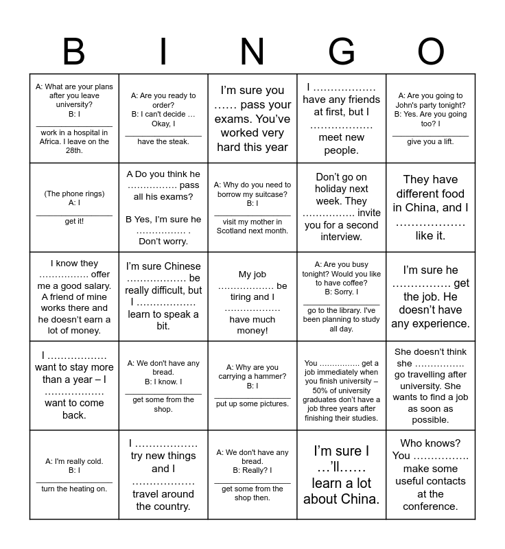 This bingo card has 25 words: A: We don't have any bread. B: I know. I __________________ get some from the shop., A: We don't have any bread. B: Really? I __________________ get some from the shop then., A: Why do you need to borrow my suitcase? B: I __________________ visit my mother in Scotland next month., A: I'm really cold. B: I __________________ turn the heating on., A: Are you going to John's party tonight? B: Yes. Are you going too? I __________________ give you a lift., A: What are your plans after you leave university? B: I __________________ work in a hospital in Africa. I leave on the 28th., (The phone rings) A: I __________________ get it!, A: Are you ready to order? B: I can't decide … Okay, I __________________ have the steak., A: Are you busy tonight? Would you like to have coffee? B: Sorry. I __________________ go to the library. I've been planning to study all day., A: Why are you carrying a hammer? B: I __________________ put up some pictures., Don’t go on holiday next week. They ……………. invite you for a second interview., I know they ……………. offer me a good salary. A friend of mine works there and he doesn’t earn a lot of money., You ……………. get a job immediately when you finish university – 50% of university graduates don’t have a job three years after finishing their studies., She doesn’t think she ……………. go travelling after university. She wants to find a job as soon as possible., A Do you think he ……………. pass all his exams? B Yes, I’m sure he ……………. . Don’t worry., Who knows? You ……………. make some useful contacts at the conference., I’m sure he ……………. get the job. He doesn’t have any experience., I’m sure you …… pass your exams. You’ve worked very hard this year, They have different food in China, and I ……………… like it., I’m sure Chinese ……………… be really difficult, but I ……………… learn to speak a bit., My job ……………… be tiring and I ……………… have much money!, I ……………… try new things and I ……………… travel around the country., I ……………… want to stay more than a year – I ……………… want to come back., I ……………… have any friends at first, but I ……………… meet new people. and I’m sure I …’ll…… learn a lot about China..