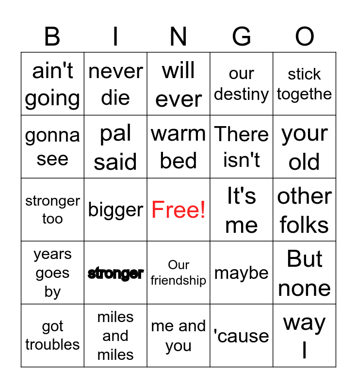 This bingo card has a free space and 24 words: stronger, miles and miles, warm bed, got troubles, stick togethe, ain't going, gonna see, never die, It's me, Our friendship, There isn't, stronger too, maybe, But none, pal said, 'cause, other folks, will ever, your old, bigger, way I, years goes by, our destiny and me and you.