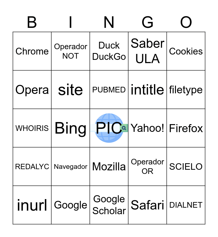 This bingo card has a free space and 24 words: Navegador, Google, PUBMED, inurl, Cookies, Chrome, Opera, Operador NOT, Yahoo!, Mozilla, intitle, WHOIRIS, Operador OR, SCIELO, site, Safari, Firefox, Duck DuckGo, filetype, Bing, DIALNET, REDALYC, Saber ULA and Google Scholar.