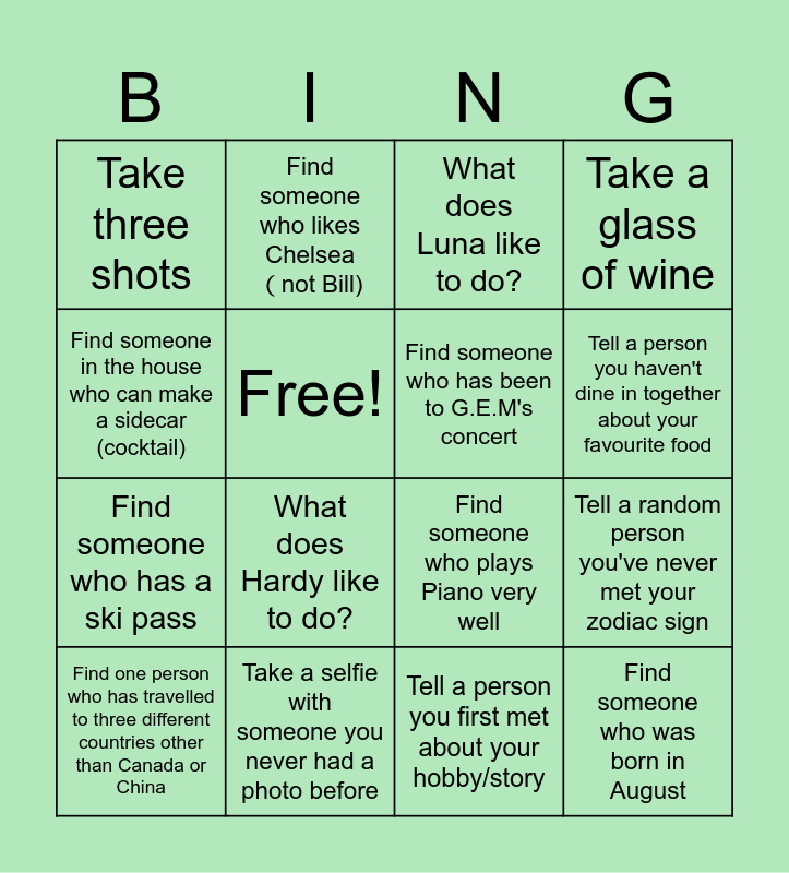 This bingo card has 16 words: Find one person who has travelled to three different countries other than Canada or China, Take a selfie with someone you never had a photo before, What does Luna like to do?, Take a glass of wine, Find someone in the house who can make a sidecar (cocktail), Find someone who likes Chelsea (not Bill), Find someone who plays Piano very well, Tell a random person you've never met your zodiac sign, Take three shots, Free!, Tell a person you first met about your hobby/story, Tell a person you haven't dine in together about your favourite food, Find someone who has a ski pass, What does Hardy like to do?, Find someone who has been to G.E.M's concert and Find someone who was born in August.