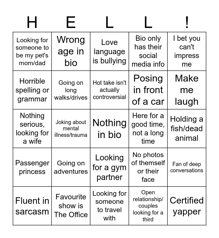 This bingo card has a free space and 24 words: Going on adventures, Favourite show is The Office, Hot take isn't actually controversial, Fluent in sarcasm, I bet you can't impress me, Looking for someone to be my pet's mom/dad, Horrible spelling or grammar, Wrong age in bio, Here for a good time, not a long time, Looking for a gym partner, Posing in front of a car, Nothing serious, looking for a wife, No photos of themself or their face, Fan of deep conversations, Going on long walks/drives, Open relationship/ couples looking for a third, Holding a fish/dead animal, Love language is bullying, Make me laugh, Joking about mental illness/trauma, Certified yapper, Passenger princess, Bio only has their social media info and Looking for someone to travel with.