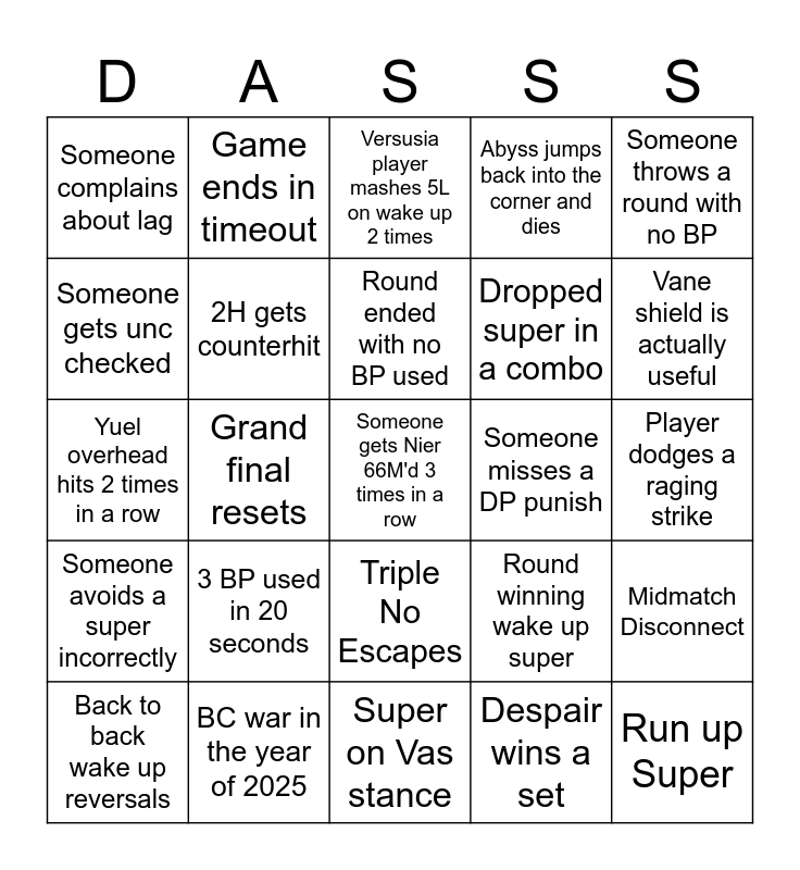 This bingo card has a free space and 24 words: 3 BP used in 20 seconds, BC war in the year of 2025, Round ended with no BP used, Back to back wake up reversals, Someone throws a round with no BP, Someone complains about lag, Someone gets unc checked, Game ends in timeout, Someone misses a DP punish, Triple No Escapes, Dropped super in a combo, Yuel overhead hits 2 times in a row, Round winning wake up super, Midmatch Disconnect, 2H gets counterhit, Despair wins a set, Player dodges a raging strike, Versusia player mashes 5L on wake up 2 times, Vane shield is actually useful, Grand final resets, Run up Super, Someone avoids a super incorrectly, Abyss jumps back into the corner and dies and Super on Vas stance.