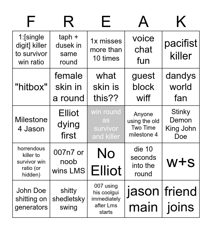 This bingo card has a free space and 47 words: more than 2 twotimes in a lobby, shitty shedletsky swing, someone with 3+ days, get jumped after being stunned, dandys world fan, horrendous killer to survivor win ratio (or hidden), taph + dusek in same round, <4 minute round, guest block wiff, friend joins, "hitbox", female skin in a round, jason main, w+s, server with 6+ players, newbie, what skin is this??, die 10 seconds into the round, targeting accusations, 1:[single digit] killer to survivor win ratio, 007n7 or noob wins LMS, guest uses charge to get away from killer, voice chat fun, pacifist killer, Sentinels emoting somewhere, Elliot dying first, No Elliot, Roleplayer, Stinky Demon King John Doe, Milestone 4 Jason, Chance shooting himself, Dusekarr putting a completely unnecessary barrier, Shedletsky asking for heals, Someone stealing a medkit with an Elliot or support in the round, Builderman not putting down buildings, 007 wasting coolgui to move around, 007 using his coolgui immediately after Lms starts, 3 or more shedletsky missing at the same time, Sentinels hitting a killer with a stun while they can't be stunned, John Doe shitting on generators, C00lkidid completely missing his walk speed override, 1x misses more than 10 times, Anyone using the old Two Time milestone 4, Someone blaming the Sentinels in chat/blaming support, Full round of sentinels, Noob using a slate skin and dying immediately after the effects end and Noob thinking the ghostburger makes them completely invisible.