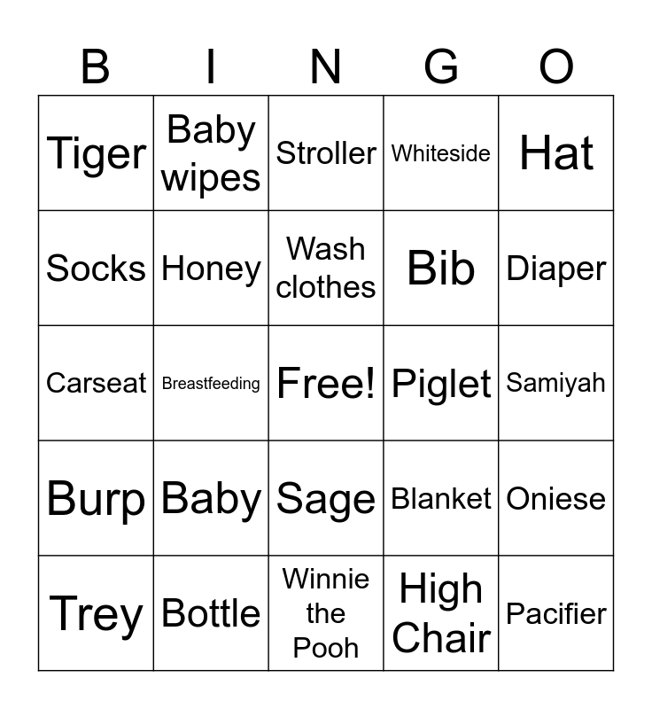 This bingo card has a free space and 24 words: Trey, Baby, Wash clothes, High Chair, Hat, Tiger, Baby wipes, Stroller, Piglet, Samiyah, Carseat, Honey, Blanket, Oniese, Socks, Bottle, Winnie the Pooh, Whiteside, Diaper, Burp, Breastfeeding, Sage, Bib and Pacifier.
