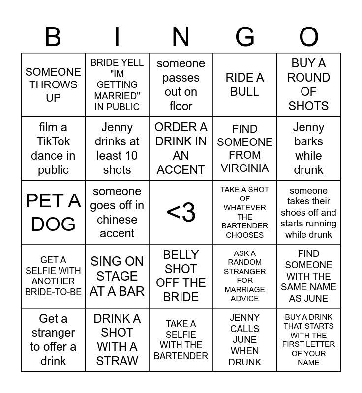 This bingo card has a free space and 24 words: Get a stranger to offer a drink, SING ON STAGE AT A BAR, ORDER A DRINK IN AN ACCENT, JENNY CALLS JUNE WHEN DRUNK, BUY A ROUND OF SHOTS, SOMEONE THROWS UP, BRIDE YELL "IM GETTING MARRIED" IN PUBLIC, someone passes out on floor, TAKE A SHOT OF WHATEVER THE BARTENDER CHOOSES, someone takes their shoes off and starts running while drunk, PET A DOG, Jenny drinks at least 10 shots, ASK A RANDOM STRANGER FOR MARRIAGE ADVICE, FIND SOMEONE WITH THE SAME NAME AS JUNE, film a TikTok dance in public, DRINK A SHOT WITH A STRAW, TAKE A SELFIE WITH THE BARTENDER, RIDE A BULL, Jenny barks while drunk, GET A SELFIE WITH ANOTHER BRIDE-TO-BE, someone goes off in chinese accent, BELLY SHOT OFF THE BRIDE, FIND SOMEONE FROM VIRGINIA and BUY A DRINK THAT STARTS WITH THE FIRST LETTER OF YOUR NAME.