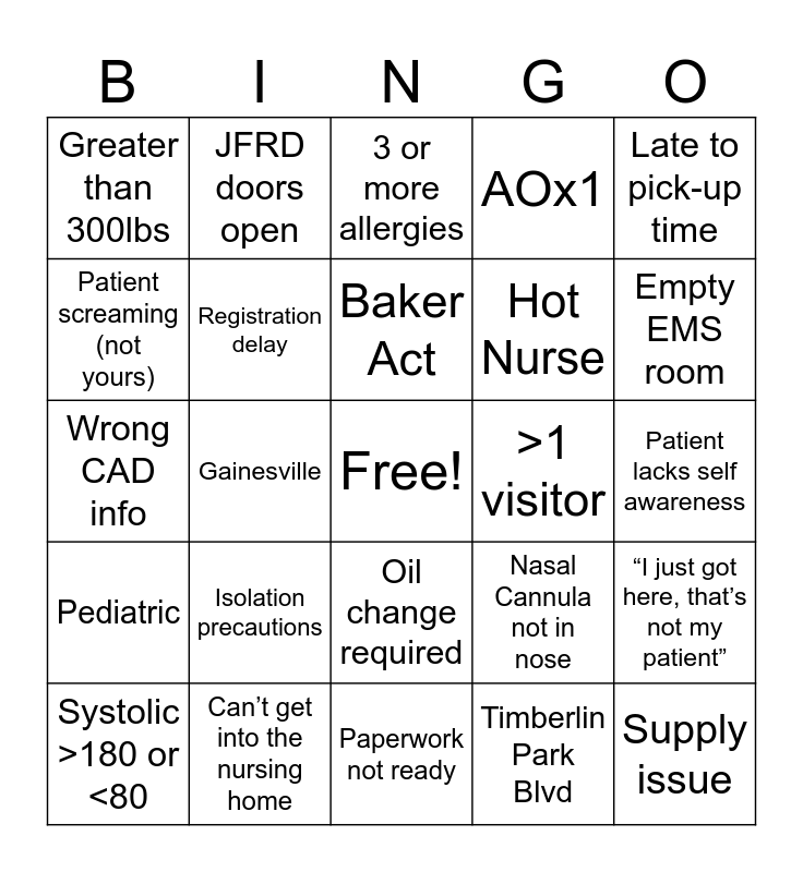 This bingo card has a free space and 27 words: Nasal Cannula not in nose, DNR, Hot Nurse, Paperwork not ready, Patient screaming (not yours), 3 or more allergies, JFRD doors open, Pediatric, >1 visitor, “I just got here, that’s not my patient”, Wrong CAD info, AOx1, Systolic >180 or <80, Can’t get into the nursing home, Empty EMS room, Used urinal, Registration delay, Baker Act, Isolation precautions, Greater than 300lbs, Patient lacks self awareness, Timberlin Park Blvd, Gainesville, Supply issue, Oil change required, Late to pick-up time and “Threeeeee fourtwo to comms”.